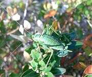 The grass-green body, which is about 15 millimetres (0.59 in) long, carries minute black specks, as reflected in the common and Latin name of the species; in addition, the dorsal surface of the abdomen features a brown stripe; this is more pronounced in the male.[1][2] A yellow-white stripe extends backwards from the eyes.[3] The lower legs and feet are brownish.[2] The antennae are twice as long as the body.[1] The species is brachypterous: the male's forewings are reduced to small flaps, and those of the female are even more reduced.[1][2] The hindwings are completely absent, and both males and females are flightless.[1][2]