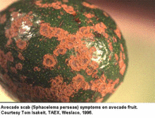The symptoms on the fruit are the scabs that the disease is named for. They appear as raised bumps with irregular borders and can be brown or purple in color. The lesions are generally 3mm in diameter but have been measured up to 10mm.[10] The texture of the scabs are rough and cracked which is in contrast to the smooth and shiny avocado skin. The dramatic differences in color and texture make it easy to identify the scabs on host trees. Procession of the infection leads to fusion of the discrete scabs to form larger rutted patches. These areas may crack, exposing the vulnerable tissue underneath and allowing secondary organisms such as Colletotrichum gloeosporioides to penetrate into the fruit tissue and cause anthracnose.[11]