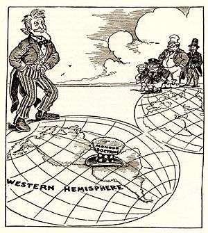 A newspaper cartoon highlighting the United States' influence in Latin America following the Monroe Doctrine.