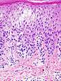 Histopathological image of dyshidrotic dermatitis, showing focal spongiotic change in the epidermis.