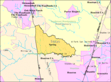 Spring is a census-designated place (CDP) within the extraterritorial jurisdiction of Houston in Harris County, Texas, United States, part of the Houston–The Woodlands–Sugar Land metropolitan area.[3] The population was 54,298 at the 2010 census.[4] While the name "Spring" is applied to a large area of northern Harris County and a smaller area of southern Montgomery County, the original town of Spring, now known as Old Town Spring, is located at the intersection of Spring-Cypress and Hardy roads and encompasses a relatively small area of perhaps 1 km2.