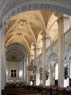 In the late 17th and early 18th centuries, the church was an important center of musical culture in Düsseldorf. The composer Johann Hugo von Wilderer served as its organist. The mausoleum, designed by Venetian architect Simone del Sarto, contains the tombs of several Electors Palatine, including that of Johann Wilhelm.[4] The high altar of the church was destroyed during World War II. The new altar, designed by Ewald Mataré was built in 1960. Paintings by Ernst Deger can be found in the church's two side altars which are dedicated to the Virgin Mary.[5]