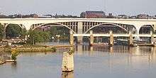 The I-35W Saint Anthony Falls Bridge crosses the Saint Anthony Falls of the Mississippi River in Minneapolis, Minnesota in the U.S., carrying north-south traffic on Interstate Highway 35W. The ten-lane bridge replaced the I-35W Mississippi River bridge, which collapsed on August 1, 2007. It was planned and is maintained by the Minnesota Department of Transportation (Mn/DOT). The planning, design, and construction processes were completed faster than normal because Interstate 35W is a critical artery for commuters and truck freight.[1] The bridge opened September 18, 2008, well ahead of the original goal of December 24.[5]
