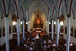 In 1892 the present rectory was built as a Franciscan monastery with 30 rooms plus a spacious attic. The parish then numbered about 100 families, fairly evenly divided between farmers, railroad people, and other business people. In 1894 a large sanctuary was added to the church building along with two transepts containing large stained-glass windows made by George A. Misch and Brothers of Chicago. The south window depicts the three patrons of the Franciscan order: St. Clare, St. Louis IX, King of France, and St. Elizabeth.[3] Much of the statuary dates back to the late 19th century and was manufactured in Munich, Germany.[4]:55