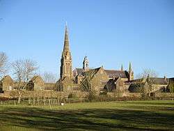 The buildings are in a French Gothic Revival style described by some as "weak",[2] although Pevsner's judgement was that "The plan is magnificent and can only be properly seen from the air". The church has relics of Saint Hugh of Lincoln, Saint Boniface and the Virgin Mary; and an unusually tall (203 ft) spire. It stands in the centre of buildings including a library with a collection of rare books and manuscripts and a chapter house decorated with images of the martyrdom of the monks' predecessors. The Great Cloister, more than a kilometre long and one of the largest in the world, connects the 34 hermitages to the church and the other buildings, embracing four acres of orchards and the monastic burial ground.[3]