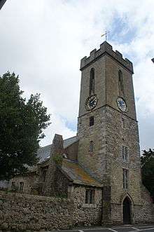 The church consists of nave with north and south aisles, a chancel and a western tower. The original church was said by local tradition to have been at the east end of the town, and its foundations were visible in the old churchyard in 1845. Destroyed by the French in their raid of 1377, it is said to have been rebuilt on the present site only to be again reduced to a ruin in 1543. At the beginning of the 17th century it was practically rebuilt, and reconsecrated by John Davenant the Bishop of Salisbury on 11 March 1626. The chancel, which had a polygonal roof with enriched bosses at the intersection of the ribs, was lengthened by 12 ft. in 1889.