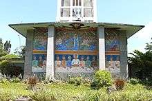 The mural inside the church, commonly called “The Angry Christ”, is by Philippine-born Alfonso Ossorio, friend of the famous Jackson Pollock and Clyfford Still. Mosaics are by the Belgian Adelaide de Bethune. The materials and talents were provided by the locals.[2]
