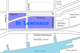 St. Lawrence is a neighbourhood located in downtown Toronto, Ontario, Canada. The area, a former industrial area, is bounded by Yonge, Front, and Parliament Streets, and the Canadian National railway embankment. The Esplanade off Yonge St., lined with restaurants, cafés and hotels runs through the middle of the area. In previous times, the area was sometimes referred to as 'St. Lawrence Ward' or more often today as 'St. Lawrence Market', synonymous with the large retail vendor market which is the neighbourhood's focal point. The area is the site of a large city-sponsored housing project of the 1970s, which revitalized an old 'brownfields' area. The boundaries of the St Lawrence Neighbourhood Association and the St Lawrence Market BIA are somewhat larger than those noted above. Both groups have boundaries that extend from Yonge to Parliament Streets and Queen Street East to the rail corridor.