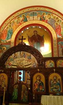 As of April 2013, Fr. Theodore has completed the eastern part of the church (including the whole Holy Altar area, main dome and the pandentifs), the entrance porch (so called exo-narthex) and one fresco composition on the western gallery, the one of the patron-feast "Dormition of the Most Holy Birth-giver of God" (donated by the youth organization-"Macedonian Orthodox Philanthropic Society of Columbus"-MOPS). In this, he has depicted many important and traditional frescoes. For example, on the far wall of the altar is the most holy Theotokos, or the icon, Our Lady of the Sign also known as "more spacious than the heavens" (Greek: Πλατυτέρα των Ουρανών [Platytera ton ouranon]). In addition to this, he has also depicted The Ascension of Jesus and the Feast of the Pentecost is also depicted. Fr. Theodore is the author of the completely all-new icons of the iconostasis.