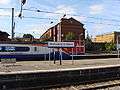 Northbound Midland Mainline train, formed of Class 222 Meridian units, passing through Platform 4. East Midlands Trains services regularly pass through the station but do not stop.