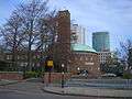 With the Roman Catholic population in Birmingham increasing in the 19th century, a Catholic school was built on Windmill Street in 1869 to provide an education for the new families in the area.[1] Later, a new church had to be built to accommodate their needs. So on 30 April 1874, the foundation stone for a new Gothic revival church, St Catherine of Siena's, was laid in the Horse Fair part of the city by Bishop William Ullathorne of Birmingham. He also presided at the opening ceremony of the church on 28 September 1875. Originally, only the nave and sanctuary was built.[2][3] By October 1893, the chancel, lady chapel and sacristy were ready and by 1909 the tower was completed. By 1918 the church was free of debt and consecrated in June that year. It was located where the Holloway Circus roundabout is situated on Bristol Street, Birmingham.[2]