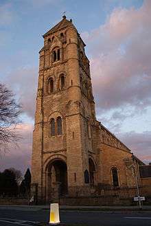 The church is built in ashlar magnesian limestone and has a green slate roof in the Romanesque style. There is a seven bay aisled nave and chancel with small east Lady Chapel and a five-stage west tower with buttresses to the fourth stage. At the southwest corner of the tower there is a square stair-turret which becomes cylindrical after the second stage and has a conical roof above the fifth stage. The base of the tower is open to the first stage and has round arches on three sides. The tower has a pyramidal ashlar roof with a finial. The vestry is on the north side and on the south side there is a chapel.[1]