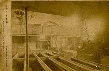 According to former county archaeologist Alison Taylor the church was serving the impoverished and fast growing community of the upper town,[10] in the neighbourhood of the castle mound, and its shire hall (assize court) (1842) and prison, when a new building was planned, incorporating elements from the previous church.[6][11] The new Victorian building, standing a little north of the one it replaced, was erected to the design of T. H. and F. Healey, architects, of Bradford. In the new church, the early 12th century chancel arch of the older church was reset between the south aisle and the south chapel, and a late 12th century doorway was reset between the north aisle and the vestry.[12] The stone Carr Monument (early 17c.), commemorating Nicholas Carr, appointed the University's second Regius Professor of Geek in 1547, was reset in the south wall of the south chapel (the Lady Chapel).[6][13]