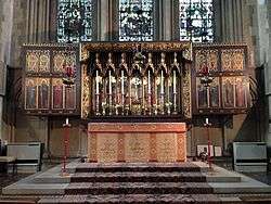 Historic England, recording St Giles' Grade II*-listed status, describes it as being "of outstanding quality by virtue of its collection of medieval and C18 survivals, together with C19 fittings by many of England's leading church decorators".[15] The interior was decorated in the style favoured by the Oxford Revival,[16] with Sir Charles Kempe and Sir Ninian Comper commissioned to provide much of the design work,[17] and the church still houses works after Michelangelo and a copy of Chatsworth House version of the Adoration of the Magi by Paolo Veronese. Much of the wood carvings were supplied in the late 19th century by Bavarian wood-carvers from Oberammergau.
