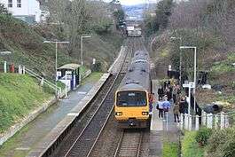 Most trains that call at St James Park are Avocet Line services between Exmouth and Exeter St Davids. Beyond St Davids they generally continue to Paignton or, less frequently, to Barnstaple. A few trains terminate or start at St James' Park instead of continuing to Exmouth; these use a siding at Exmouth Junction to reverse direction. Four trains on summer Sundays are provided through to Okehampton.[2] Connections are available at Exeter Central for Pinhoe and stations to London Waterloo as these trains run through St James Park without stopping; passengers for other main line stations change at Exeter St Davids.