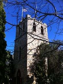 The church is a stone building with gabled roofs covered in shingles.[4] The aisle of the church is made from 22-centimetre (9 in) thick blocks that had been made in England.[5] The stone walls are 540 millimetres (21 in) thick and the building also has stone foundations; the stone was thought to be quarried from nearby Mount Melville and Mount Clarence. The walls are so thick that no buttresses are required.[4] The original building is now the nave of the present church, with the gallery behind built in 1852. The tower and porch were completed in 1853. The tower is topped with battlements on the parapet.[4]