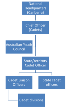Cadet divisions are headed by a divisional officer, who is in turn assisted by cadet leaders and cadet NCOs. The divisional officer may also have adult members assisting them, as well as other divisional officers or adult NCOs. This often depends on the side of the division. Cadet divisions may also be 'combined' with an adult division, meaning that they share resources and are essentially the same division, with the same divisional superintendent, same meeting place and same equipment. School divisions also exist across Australia, such as Bonnyrigg High School Division in Western Sydney,[9] and Carey Grammar Division in Victoria.