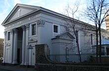 William Hallett, the architect, is not known to have been responsible for any other buildings in Brighton or elsewhere,[4] and he based the design of St John the Baptist's very closely on that of St Mary Moorfields in London, completed in 1820.[7] In particular, the southern frontage – which faces Bristol Road – is almost identical to that of St Mary's. The church is Classical in style, with a stuccoed exterior and a large pediment above the entrance.[4] The shallow roof is made of slate. The entrance porch is flanked by two columns with accompanying pilasters, and there are two more pilasters at the corner of the building. Blind doorways between the two sets of pilasters have small pediments and two deep-set windows above them. Below the main pediment and dentil cornice is a Latin inscription: DEO SUB INVOC. S. JOANNIS BAPT. ("To God, under the invocation of St. John the Baptist.") There is a side entrance in the western face, again with a pediment above it.[4][7]