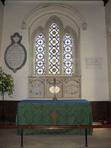 The chancel was rebuilt in the 19th century,[8][9] and a vestry was added on the northwest side.[3][12] Minor restoration work was carried out in the 20th century. A blocked window, discovered in the north wall of the chancel, was found be an original Anglo-Saxon window.[8][13] The former side-chapel on the north side was discovered during excavation work in 1918.[10] The lychgate at the entrance to the churchyard was built in the early 1920s by Philip Mainwaring Johnston[14] and serves as Clayton's war memorial. A Falklands War casualty is commemorated, and there is also a military grave from that conflict in the churchyard, where American theatrical producer Marc Klaw is also buried. To commemorate the Millennium, new stained glass was inserted in the west window of the nave; the design received considerable praise.[5]