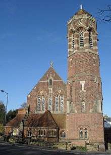 Arthur Blomfield's church of 1881 was built in his preferred Early English Gothic Revival style, mostly in red brick with some Bath Stone dressings.[6][27] The arcade-flanked nave had five and a half bays—an arrangement also seen[15] at Blomfield's St John the Evangelist's Church in Preston Village, Brighton—a clerestory and a queen post ceiling. The aisles on the north and south sides had brick arches and Bath Stone pillars. The chancel had an organ chamber.[27] The octagonal tower at the southwest corner (a local landmark)[12] rose in four stages, the topmost of which had four bells.[1][24][27] The church also had a baptistery.[22]