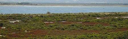 Large, constructed saltwater evaporation lagoons surround the only road into the suburb. Imperial Chemical Industries (ICI) began construction of the Solar Evaporation Lagoons in 1935 using up to 600 workers to dig out the lagoons by hand and then expanded them mechanically after World War II.[14] The lagoons stretch in a broken chain from Dry Creek to Port Gawler alongside the Barker Inlet, and are approximately 30 kilometres (19 mi) north–south by 3 kilometres (2 mi) east–west. The lagoons are filled in spring and salt normally harvested in autumn when it is piped as saturated brine solution to Osborne on the Le Fevre peninsula, and used by Penrice Soda Products in the only soda ash production facility in Australia.[14][15] The lagoons proliferate with bird life and have been recognised as a bird sanctuary due to their status as an important breeding and feeding area for species from as far away as Alaska. As of 2006 the Lagoons are operated by Cheetham Salt Limited with 600,000 tonnes of salt used by Penrice in creating soda ash via the solvay process.[16][17]