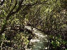 St Kilda is adjacent to the mangrove forest bordering Barker Inlet, part of the largest tidal estuary of Gulf St Vincent. Late in the 19th Century embankments were constructed through the mangroves in an effort to reclaim land for pasturing. With the construction of the banks of the adjacent saltfields maintenance of the embankments ceased and the mangroves began to reclaim them. One of these embankments is used as the beginning of a boardwalk through the mangroves which forms a 1.7 km loop[18] through the samphire saltmarsh flats and mangroves reaching the border between the ocean and forest.