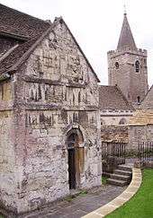 It is the most complete Anglo-Saxon survival from this period, and follows what seems to have been a typical monastic plan at the time, though in miniature. In particular the decoration including fragments of large reliefs gives a hint of richness which documentary remains record in monastic churches.[8] Although the existing church seems all or almost all Anglo-Saxon, it has clearly been altered in a number of ways, apart from the modern restoration, which included removing the stairs inside and filling in windows. For its small size, with the nave only some 7.5 metres long and a little over 4 m wide, the height of the building (c. 8m inside the nave) is notable.[9] A porticus to the south has been lost, but otherwise the structure of the building seems complete in its final Anglo-Saxon state.