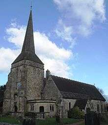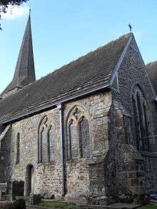 Within a century, the church underwent the first of several major structural alterations which have resulted in "seven different medieval styles [and] building periods" being represented.[5] Around the end of the 12th century, the nave was extended by the addition of a south aisle, for which the south wall of the nave was removed. A "typical Norman arcade" was inserted in its place.[6][8] Next, in about 1200, the west end of the chancel was altered and the chancel arch leading to the nave was removed without replacement.[8][9] More significant and "far more interesting"[8] work was then undertaken on the chancel in the third quarter of the 13th century: it was extended to the east, making it longer than the nave—a very rare pattern, whose only equivalent in a Sussex parish church is St Laurence's Church at Guestling according to one authority.[9] A pair of windows, one a lancet and the other a plain two-light opening set below a quatrefoil, were inserted in the north wall, around 1250; they are "a most remarkable example of the beginnings of tracery".[8] The fifth stage of development consisted of the construction of a Lady chapel on the south side in about 1270.[10] A two-bay arcade supported on octagonal piers separated this from the chancel.[11] Early in the 14th century, a sixth stage of rebuilding took place: this was a major redevelopment, possibly caused by fire or other structural damage.[12] The narrow south aisle was rebuilt in the Decorated Gothic style[13] to make it wider than the adjacent Lady chapel[3] (this lasted longer than the rest of the contemporary work);[12] an arch was inserted to link the chapel and aisle;[6] diagonal buttresses were added to support the east wall of the chancel;[14] two "rather coarsely executed" windows were inserted in the rebuilt south wall; and a new south entrance, a holy water stoup and a piscina were inserted.[12] At the start of the 15th century, a Perpendicular Gothic tower with "the usual shingled broach spire"[13] was built at the west end.[12][15] It obscured the nave's original west window, so a new window was inserted in the north wall instead.[3] The church, originally a small and simple building, had "doubled its size in 250 years" as a result of these alterations: "the perfect example of a church steadily expanding ... to fulfil its local requirements".[6]
