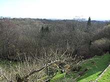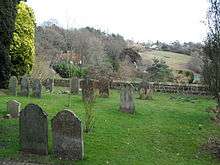 St Margaret's Church has an extensive terraced churchyard with far-reaching southward views across the Weald to the South Downs. Set across six levels, it is heavily planted with trees and flowers—more than 100 species have been documented—and has several seats and a signposted viewing area.[2][4][16][26][27] It has been extended several times. One extension, described in 1935 as "recent", brought an artificial cave, possibly of medieval origin, into its boundaries. It is hewn out of the rock near the floor of the valley above which the churchyard sits.[19]