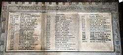 The organ case of 1910 is by Austin and Paley and from the old church there is a 1777 organ case by Samuel Green of London preserved on the vestry side of the church.[10] The three manual organ was made in 1776–78 by Samuel Green, and repaired between 1807 and 1877 by Vincent of Liverpool.[16] It was rebuilt in 1911 by Harrison & Harrison, using some of the original stops. In 1964 the pedal division was enlarged by the same company. The organ has been granted a Historic Organ Certificate Grade II*.[17] Wooden fittings also saved from the earlier church include an altar table of 1705 by Thomas Naylor in the Lady Chapel and oak canopies from the churchwardens seats of 1686.[2]