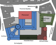 Two other buildings adjoin the right wing of the Palace and form part of the Palace complex. These are the Kavaliershaus (Gentleman's House) and the Wilhelmsbau (Wilhelm building). The Gentleman's House had already been built in 1826 by a roofer's master called Konrad Kalb as a residence and place of business, with a drugstore, hardware store and book printer's. This was acquired in 1836 by the Duke for incorporation into the Palace and became the offices of his Majordomo. The facade is in an austere neo-classical style and today serves as the main entrance for the Landtag.[16] The Wilhelmsbau was added to the complex in 1871, originally as a military hospital named after Emperor Wilhelm I. It has a red facade with colossal bust of its namesake and two tower-shaped corners. Both buildings were severely damaged in the World War II and only the facades were restored. From 1951 the Wilhelmsbau housed 400 employees of the Federal Statistical Office and after further modernization in 1988 it was taken over by the Landtag.[6]