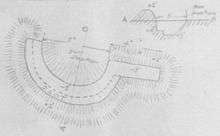 Viewing across the open eastern flank was possible from the top of the "curiously shaped heaps of broken earth" near Shellal.[39] Two tels, indicating possible sites of ancient cities, stood high above the plain and also provided excellent views. The spectacular, flat-topped Tel el Jemmi, with its perpendicular sides, one side dropping into the Wadi Ghazza, could be seen for miles. It had been used as a lookout during the first battle of Gaza.[41] Tel el Fara, on the Rafa to Beersheba road, was a flat-topped prominence with conical sides 7 miles (11 km) further south, and was approximately 16 miles (26 km) inland from the coast in the centre of the Gaza to Beersheba front line. This large mound, near the Wadi Ghazza at Shellal, was thought to have been built by the crusaders in the 13th century as an observation post; and it gave an "uninterrupted view for several miles northward and eastward."[39] At the base of Tel el Fara huge stone buttresses and several courses of cut stone could be seen at water level.[41][42]
