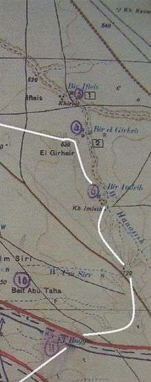 On 5 May, patrols by the New Zealand Mounted Rifle Brigade reported, having reached a line west of El Girheir to Im Siri and Kh. Khasif, when hostile posts were seen on the line near Kh. Imleih and El Buqqar. Two days later the area was reported clear of the enemy.[92]