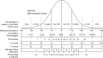 In statistics, the standard score is the signed number of standard deviations by which an observation or data is above the mean. A standard score is a derived score, used for making norm-referenced interpretations, for which the mean and standard deviation are selected to simplify interpretations. Some common standard scores and their corresponding mean and standard deviation are: ACT scores (18 and 5), SAT scores (500 and 100), T-scores (50 and 10), and z-scores (0.0 and 1.0).[1] A positive standard score indicates a datum above the mean, while a negative standard score indicates a datum below the mean. It is a dimensionless quantity obtained by subtracting the population mean from an individual raw score and then dividing the difference by the population standard deviation. This conversion process is called standardizing or normalizing (however, "normalizing" can refer to many types of ratios; see normalization for more).