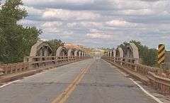 The State Highway 79 Bridge at the Red River is a bridge carrying Texas State Highway 79 and Oklahoma State Highway 79 over the Red River at the Texas-Oklahoma state line. The camelback pony truss bridge is 2,255 feet (687 m) long and has 21 truss spans. The Texas and Oklahoma highway departments built the bridge as a combined project in 1939. The bridge provided a direct route between Waurika, Oklahoma and Byers and Wichita Falls in Texas. The bridge is now the only camelback pony truss bridge remaining on a Texas state highway and is the fourth-longest truss bridge in the Texas state highway system.[2]