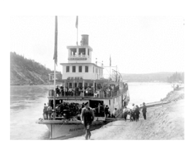 For ten years the area was without steamer service until the Charlotte was built by Alexander Watson for the North British Columbia Navigation Company in 1896. The N.B.C.N.C was organized by Senator James Reid of Quesnel, Captain John Irving of Victoria and Stephen Tingley of Ashcroft. Tingley, at this time had been the owner of the BC Express Company for eight years, having been the most famous of the "bull whips" of the Cariboo Road. They hired Captain Frank Odin to pilot her. He was her captain until 1906, when Captain Owen Forrester Browne became her pilot.[2] The Charlotte was the only steamer on the upper Fraser until 1909 when it was announced the Grand Trunk Pacific Railway would be crossing the Fraser River at Fort George. The Quesnel was launched by Telesphore Marion, a pioneer merchant from the town of the same name. It would become the fourth sternwheeler to work the upper Fraser and would also be the last. Her pilot was Captain DA Foster.[1]