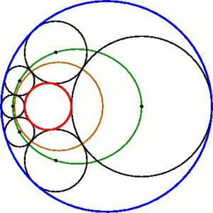 Hierarchical Steiner chains are yet another generalization. If the two given circles of an ordinary Steiner chain are nested, i.e., if one lies entirely within the other, then the larger given circle circumscribes the Steiner-chain circles. In a hierarchical Steiner chain, each circle of a Steiner chain is itself the circumscribing given circle of another Steiner chain within it; this process may be repeated indefinitely, forming a fractal.