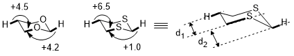 Stereoelectronic effect can be directional in specific cases. The radius of sulfur is much larger than the radius of carbon and oxygen. Thus the differences in C–S bond distances generate a much amplified difference in the two stereoelectronic effects in 1,3-dithiane (σ(C–H) → σ*(C–S)) than in 1,3-dioxane(σ(C–H) → σ*(C–O)).[3] The differences between C–C and C–S bonds shown below causes a significant difference in the distances between C–S and two C–H bonds. The shorter the difference is, the better the interaction and the stronger the stereoelectronic effect.[3]