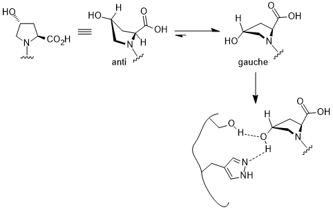 This gauche effect has a profound effect in bio-chemical research. In (2S,4R)-4-hydroxyproline fragment, the gauche interaction favors one the conformer that can bind selectively to the active site of pVHL, a domain in collagen, one of the most abundant animal protein structures and can lead to proteasomal degradation of HIF-α subunit.[8]