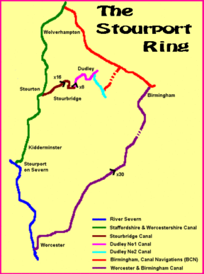 The Stourport Ring is a connected series of canals forming a circuit, or canal ring, around Worcestershire, The Black Country and Birmingham in The Midlands, England. The ring is formed from the River Severn, the Staffordshire and Worcestershire Canal, the Stourbridge Canal, the Dudley Canals, the Birmingham Canal Navigations (Netherton Tunnel Branch Canal and Birmingham New Main Line) and the Worcester and Birmingham Canal.