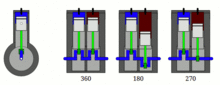 There are three main crankshaft configurations for this engine: 360°, 180°,[33] and 270°:[34][35] There are minor differences in the applications for four stroke and for two stroke engines, largely pertaining to ignition intervals. For example, the 360 twin is the natural configuration for a two-cylinder four-stroke engine, since four piston strokes add up to 720°. What follows below will mostly be concerned with four-stroke engines.