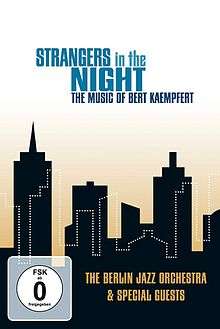 Strangers In Night - The Music Of Bert Kaempfert is the Berlin Jazz Orchestra's first home video, released on DVD September 21, 2012. This was produced using a big band, strings and choir, playing the music of Kaempfert's and conducted by former alumni, trombonist Jiggs Whigham. The DVD documents and is an edited production of one of four concerts the Berlin Jazz Orchestra performed in early 2008. The particular concert documented/presented on the DVD is a live recording and video from Frankfurt, Germany at the Alte Oper on February 12, 2008.[2]