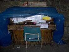 The Public Piano Project in Joshua Tree California began as a public grand piano Valentine Gift to the community in 1995 as the Self Serve Serenade by artist Piano Bob (aka Bob Fenger). In 2002 Piano Bob began a donated piano consolidation project building a weather proof outdoor piano from the parts of 3 pianos and installed April 2004 in front of Joshua Tree Health Foods. It was enjoyed by thousands of Joshua Tree National Park Visitors and locals for nearly 2 years and was reinstalled 20 April 2012 at the Coyote Corner Gift Shop in Joshua Tree as the first Public Prepared Piano.[11] The piano is reminiscent of a Gamelan Orchestra prepared with everyday items such as coins, screws, paper mutes, wedged into the strings in a typical John Cage manner(inventor of the prepared piano in the 1940s also see Bob Fenger's Acoustisizer at Prepared piano 2.10). The Public Prepared Piano is the third phase of the Public Piano Project dedication to unknown closet pianists, art in public places, and instant drum circle fun around a keyboard. Through regular tuning and maintenance of the public pianos another opportunity presented itself for the public to observe, learn and interact with the total Public Piano Project experience. Questions like:how long does it stay in tune outside? The short answer: the colder the better the more in tune. The fact that Joshua Tree is in the High Desert above Palm Springs with many 100 degree plus days in the summer gave numerous opportunities for tuning, sharing and exchanging ideas. The artist's stated intention:[12] 'The Public Piano Project creates momentary beauty thoughts and ideas that resonate out across fields, parking lots and sidewalks. It invites others to play along and gives way to song and laughter, accidental bonding and new friends; even possibly an ephemeral center of insight and change'. On 21 December 2012 Piano Bob launched his fourth phase of the Public Piano Project with the Prepared and Unprepared dueling pianos for peace at the Joshua Tree Hospice.[13] Public Piano Locations[14] Public Piano Tour Pictures 2007.[15][16][17][18]