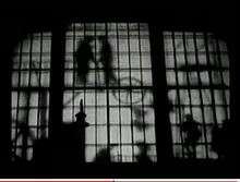 The governor sends in the military. A child walks under the soldiers' horses and his mother goes under to get him and is struck.[30] Rioting commences, and the crowd is chased off through a series of gates and barriers heading to the forge, then their apartments. The crowd is chased and whipped on the balconies. A policeman murders a small child.[31] The workers are driven into a field by the army and shot en masse.[32] This is shown with alternating footage of the slaughtering of a cow.