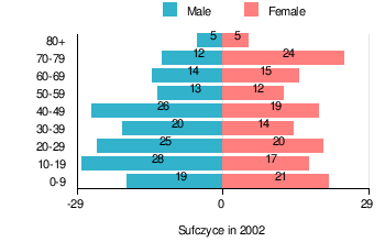 (by age group in 2002)TOTAL 0-9 10-19 20-29 30-39 40-49 50-59 60-69 70-79 80 + I. TOTAL person 312 40 45 45 34 45 25 29 36 10 — of which in % 100 12.8 14.4 14.4 10.9 14.4 8 9.3 11.5 3.2 1. BY SEX A. Males person 164 19 28 25 20 26 13 14 12 5 — of which in % 52.6 6.1 9 8 6.4 8.3 4.2 4.5 3.8 1.6 B. Females person 148 21 17 20 14 19 12 15 24 5 — of which in % 47.4 6.7 5.4 6.4 4.5 6.1 3.8 4.8 7.7 1.6