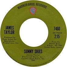 "Sunny Skies" was included on the 1990 version of the compilation album The Best of James Taylor.[5] Taylor wrote the song prior to being released from his original Apple Records contract, and a demo version of "Sunny Skies" was included as a bonus track of the 2010 CD version of Taylor's debut album James Taylor.[1][6] Taylor played the song on May 15, 1980 for the 100th episode of Saturday Night Live.[1]