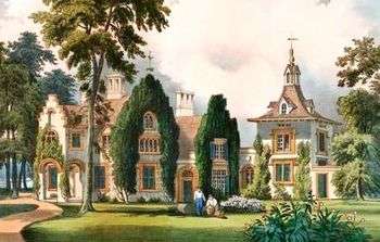 This cottage-like estate shows Dutch Colonial Revival, Scottish Gothic and Tudor Revival influences,[5] with its instantly recognizable wisteria-covered entrance and jagged crow-stepped gable.