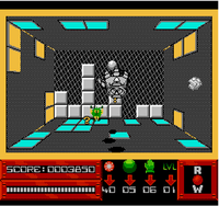 Energy balls appear and fly around the room, bouncing off of the walls, somewhat like the game of squash. When the ball hits a tile on a wall, that tile is destroyed. The player must keep the ball in play and destroy the tiles by hitting, throwing, and punching the ball around the room. The player cannot let the ball go behind the glove; if this happens, it will be destroyed, and a new one will appear. If the player loses 5 balls, a life will be lost. When all lives have been lost, it's game over, and there are no continues. The player also has a finite amount of Robo-Bullets that the glove can shoot out of its index finger by pressing the "select" button. These can destroy tiles with one hit, and they can also be used to attack enemies.