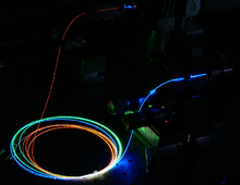 The study of atomic vapours, organic vapours and liquids by Raman absorption spectroscopy through the 1960s and 1970s drove the development of continua sources. By the early 1970s, continua formed by nanosecond duration flash lamps and laser-triggered breakdown spark in gases, along with laser excited fluorescence continua from scintillator dyes, were being used to study the excited states.[20] These sources all had problems; what was required was a source that produced broad continua at high power levels with a reasonable efficiency. In 1976 Lin and Stolen reported a new nanosecond source that produced continua with a bandwidth of 110-180 nm centred on 530 nm at output powers of around a kW.[20] The system used a 10-20 kW dye laser producing 10 ns pulses with 15-20 nm of bandwidth to pump a 19.5 m long, 7 μm core diameter silica fibre . They could only manage a coupling efficiency in the region of 5-10%.