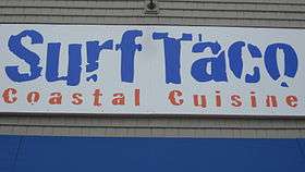 Surf Taco is a chain of Mexican-Californian cuisine-style restaurants located primarily in the Jersey Shore area. The food served is also described as Coastal Cuisine.[1] It was founded by Robert Nagel, Richard Hernon SR , Bill Bruno, and Ed Pierce in 2001.[1] There are presently ten restaurants.